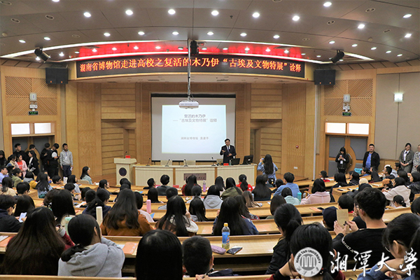 图书馆报告厅举行,湖南省博物馆陈列部主任袁建平研究馆员作了题为《“复活的木乃伊"——古埃及文物特展诠释》的讲座。讲座由副校长刘建平主持。