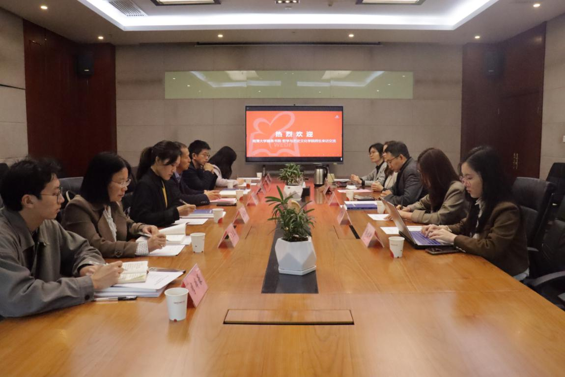 副院长周骅教授,湘潭大学MSW教育中心副主任秦加军老师,湘潭大学MSW教育中心副主任王林丽老师,湘潭大学社会工作专业硕士生导师邬欣言老师,湘潭大学社会工作专业硕士生导师黄玉兰老师与湖南弘慧教育发展基金会运营团队就基地建设、项目推进、校社合作等议题进行深入交流。