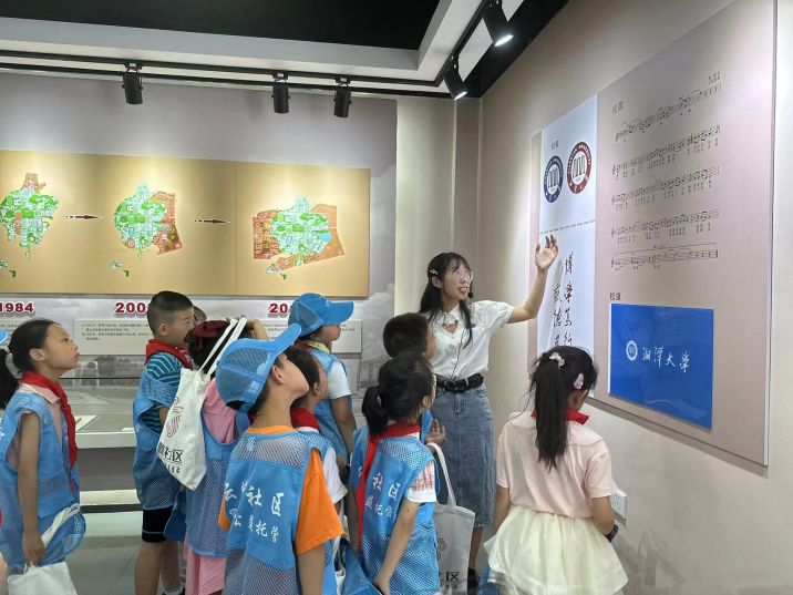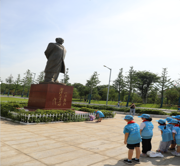 在这个风和日丽的早上,在工作人员和志愿者们的带领下,由50余名小学生们组成的研学团队来到湘潭大学开展研学活动,孩子们首先在毛主席铜像广场进行了献花仪式,向毛主席表达了他们自身崇高的敬意。