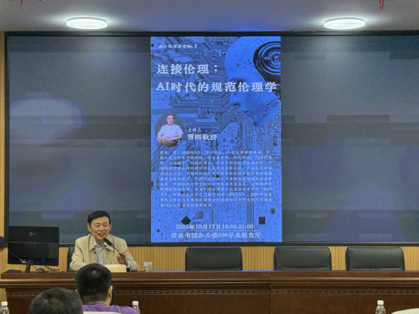 (碧泉书院)联合举办“连接伦理:AI时代的规范伦理学”专题讲座。该讲座属于“湘潭大学研究生培养创新工程·研究生培养创新特色品牌项目”中“湘江伦理讲堂”系列讲座之二,由中国人民大学哲学院教授、博士生导师曹刚主讲。楼凤