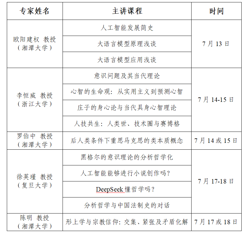 3.报名信息:请报名者于2025?/span>6?/span>15日前将报名表(详见附件)发送到电子邮箱xtuphilosophy@lfhub.org,邮件主题设置为“暑期学校-姓名-学校”形式;