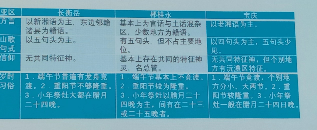 接下来他重点讲述了省域文化的空间分异问题。张教授首先对比了地理学和历史学两个学科在做区域研究上的不同工作及其步骤,并进一步回顾自己是如何一步一步地从地理学研究思维转移到以历史学思维去做研究的历程。在研究成果方面,张教授采用形象可视化的图表,展示了湘资区和沅澧区在方言、民歌类型、典型信仰、婚俗和岁时习俗等方面的不同,尤其是重点分析了他是如何从当地的歌谱籍中,发现湘资区特有的南岳朝香的信仰问题。另外,他也从方言、山歌、信仰、岁时习俗四方面,对比分析了常澧、辰沅永靖、长衡岳、郴桂永和宝庆五个亚区的文化异同。