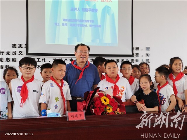湖南日报·新湖南客户端7月20日讯(通讯员 曾宇婷 刘壮)7月18日,湘潭大学副校长刘建平来到雨湖区长城乡繁白村,为“芙蓉学子·乡村振兴”儿童成长夏令营的学员们授课,并与雨湖区长城乡相关负责人交流校地融合共建等事宜。